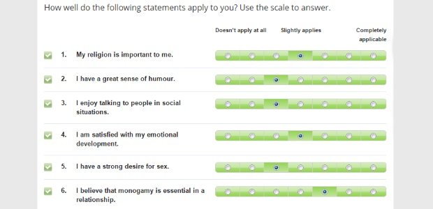 Questions are really varied and include personality traits you believe you are and want in a partner, as well as statements to agree or disagree with on a sliding scale.
